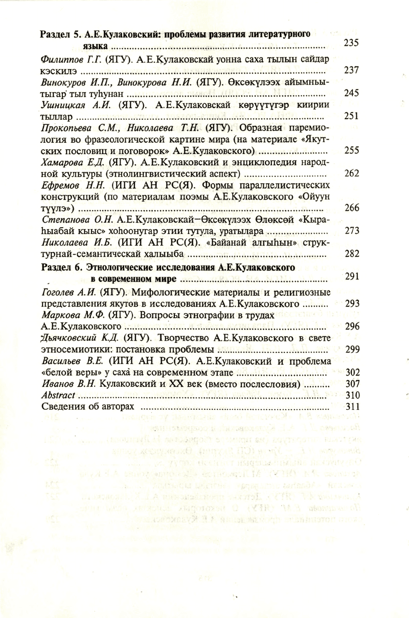 А. Е. Кулаковский в контексте историко- культурного развития в XX веке = A. E. Kulakovsky in context of historical and cultural development in the XX century : [сб. науч. ст. / отв. ред. д. и. н., проф. В. И. Иванов]. - Якутск : ИГИ АН РС (Я), 2004. - 315 с.