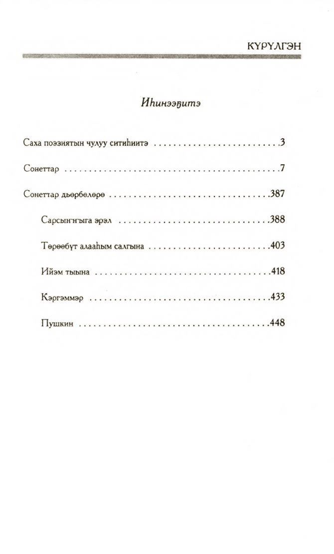 Кинигэҕэ 454 сонет киирдэ, манан поэт саха поэзиятыгар сонет уустук формата бигэтик киирбитин көрдөрөр. Ордук эдэр ыччат, оскуола үрдүкү кылааһын үөрэнээччилэрэ айылҕаҕа, олоххо, таптал дириҥ иэйиитигэр харыстабыллаахтык сыһыаннаһан бэйэлэрин кэскиллэрин эрдэттэн боччумнаахтык тэринэллэригэр поэт тоҕоостоох санаалары уонна тус бэйэтин философскай көрүүлэрин билсиһиннэрэр