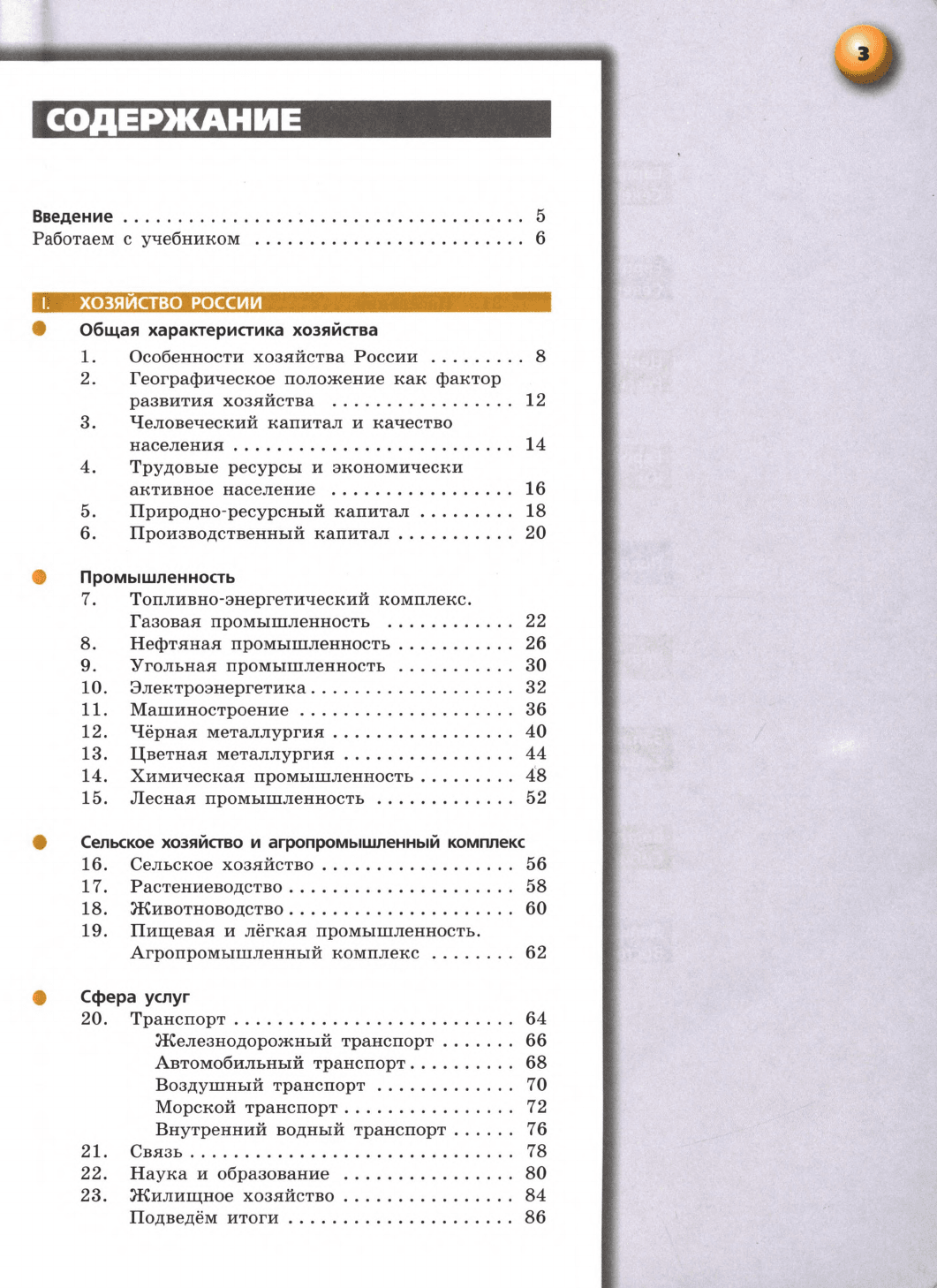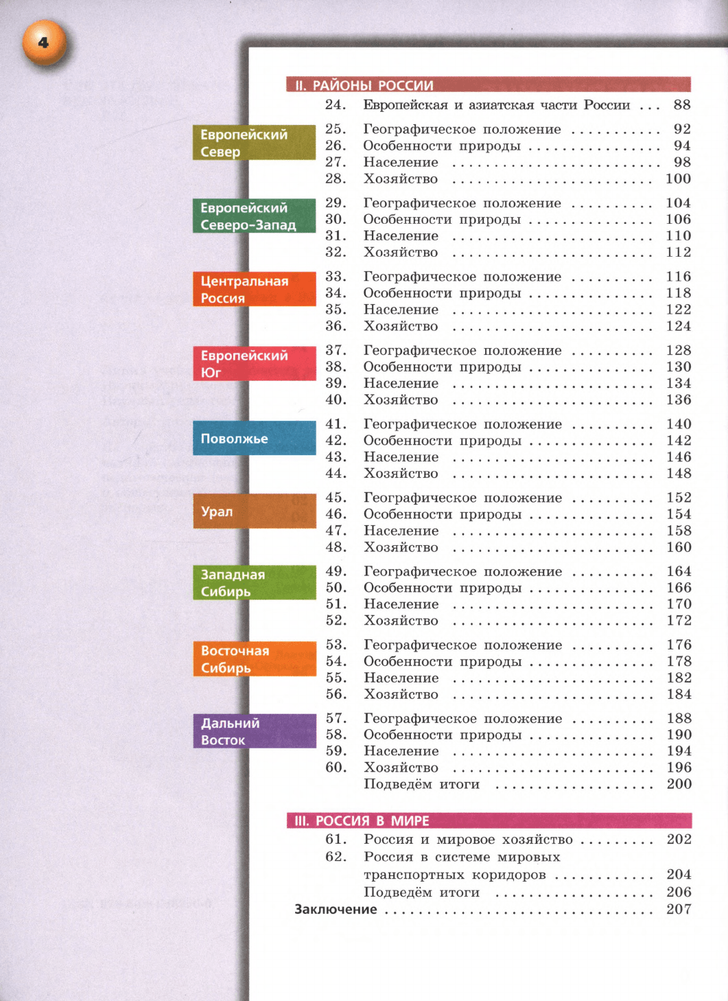 Издание является второй частью блока "География. Россия: природа, население, хозяйство". Содержательно материал учебника продолжает формирование у учащихся представлений о России как целостном географическом регионе и субъекте мирового географического пространства. Главы учебника посвящены изучению особенностей хозяйства России, его отраслевого состава, а также комплексному изучению районов страны и положения России в мире. Главными особенностями данного учебника являются фиксированный в тематических разворотах формат, жесткая и лаконичная структурированность текста, обширный и разнообразный иллюстративный ряд