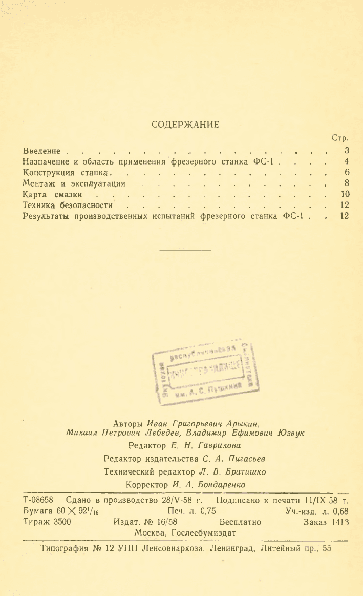 Арыкин, И. Г. Фрезерный станок ФС-1 и опыт его эксплуатации / И. Г. Арыкин, М. П. Лебедев, В. Е. Юзвук. — Москва, Ленинград : Гослесбумиздат, 1958. — 13 с. : ил. ; 22 см.