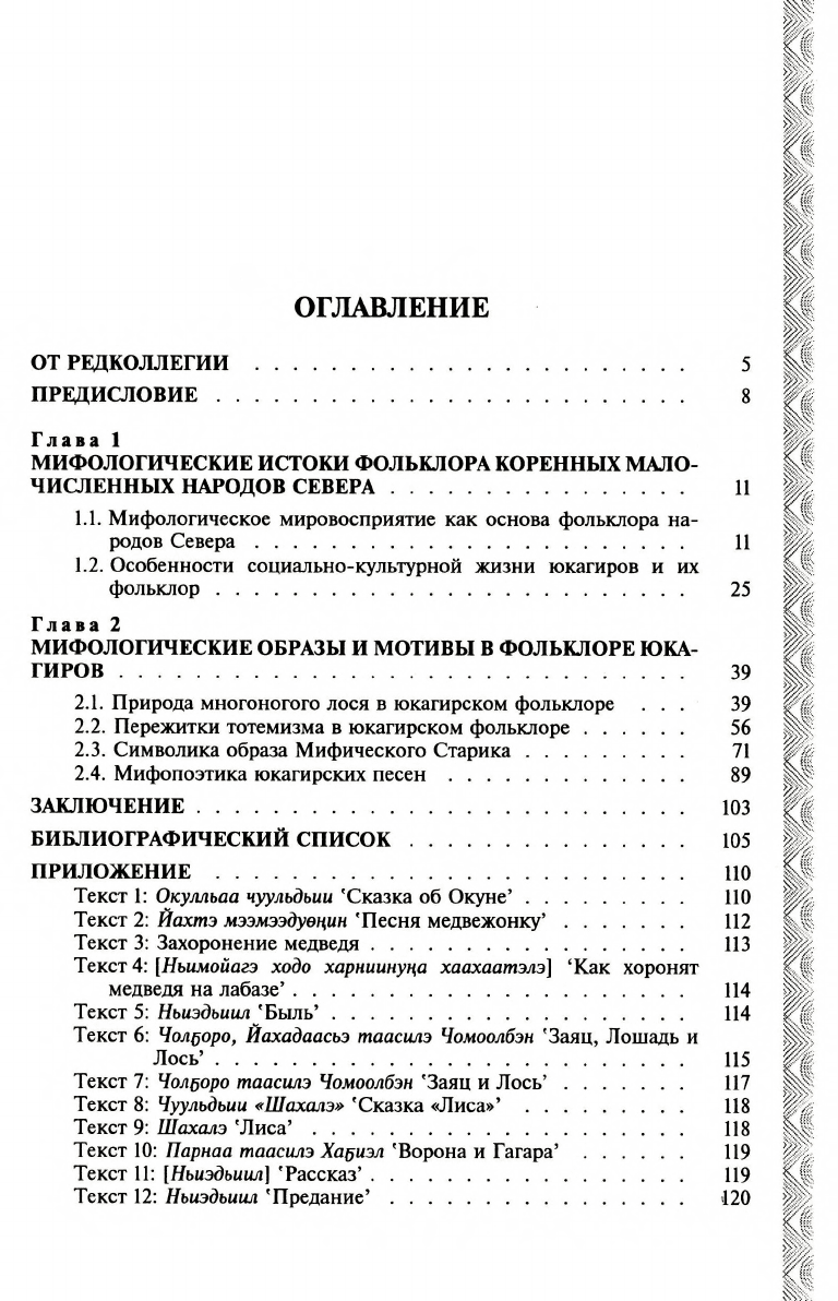 На основе анализа фольклорных текстов юкагиров в контексте мифологии и фольклора народов циркумполярной культуры автор показывает своеобразие мифотворческой мысли юкагирского народа, результатом которой явились те или иные фольклорные факты. В работе предпринята попытка объяснить происхождение таких самобытных образов юкагирского фольклора, как хитроумный Заяц, Мифический Старик - людоед, шестиногий лось, имеющий своего хозяина; анализируется песенный фольклор юкагиров, поэтическая образность которого также проистекает из мифа. Книга содержит приложение, где помещены фольклорные тексты верхнеколымских юкагиров на русском и юкагирском языках, собранные автором в 1989-2006 гг. Данные полевые материалы публикуются впервые. Книга предназначена для фольклористов, этнографов, культурологов и всех, кто интересуется устным народным творчеством коренных малочисленных народов Севера