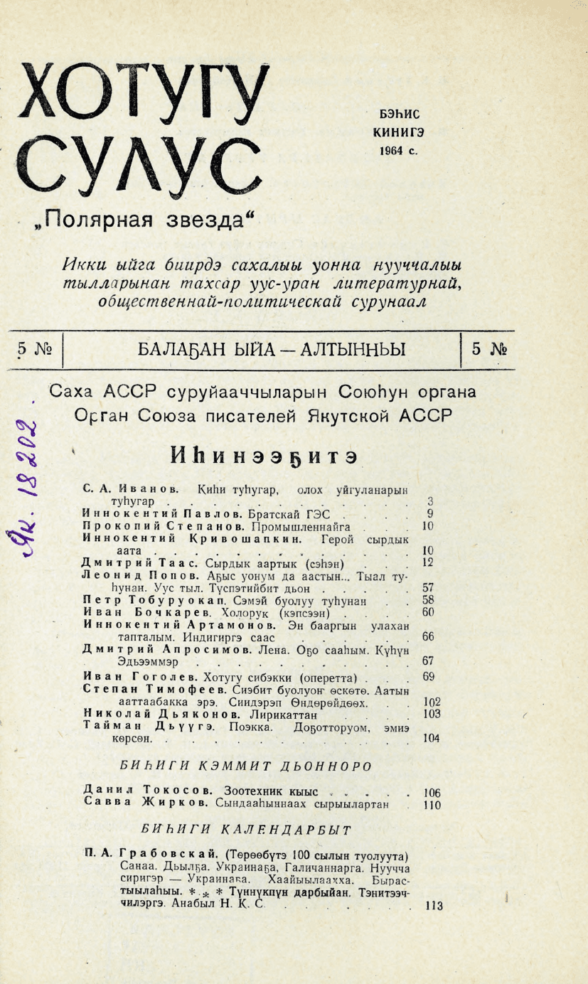 Хотугу сулус : [сахалыы тылынан уус-уран литературнай уонна общественно-политическай сурунаал] / САССР советскай суруйааччыларын союһа. - Якутскай : Саха сиринээҕи кинигэ издательствота, 1940-1989.