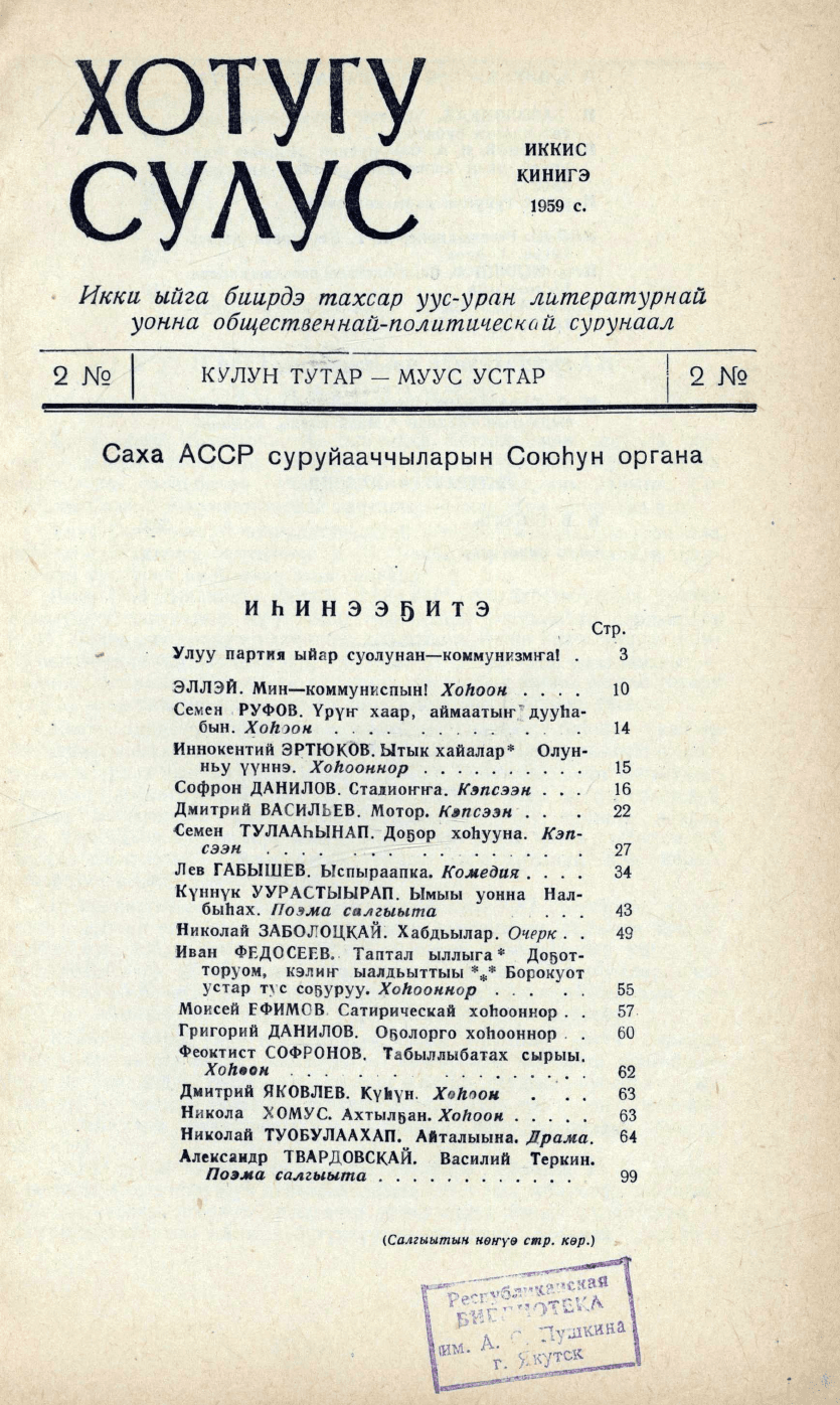 Хотугу сулус : [сахалыы тылынан уус-уран литературнай. уонна общественно-политическай сурунаал] / САССР сов. суруйааччыларын союһа. - Якутскай : Саха сиринээҕи кинигэ изд-вота, 1940-1989. 1959, N 2, кулун тутар-муус устар. - 1959. - 143, [1] с.