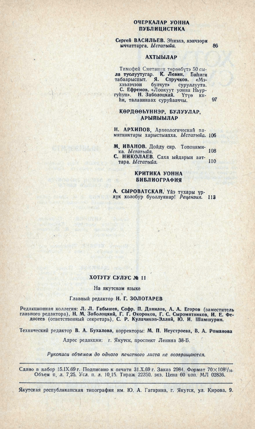 Хотугу сулус : [сахалыы тылынан уус-уран литературнай уонна общественно-политическай сурунаал] / САССР советскай суруйааччыларын союһа. - Якутскай : Саха сиринээҕи кинигэ издательствота, 1940-1989. 1969, N 11. - 1969. - 116 с.