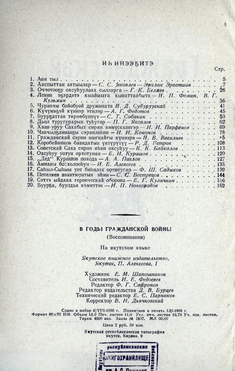 Гражданскай сэрии сылларыгар : [ахтыылар / сост. И.Е.Федосеев]. - Якутскай : Саха Сиринээҕи кинигэ изд-вота, 1960. - 176 с.