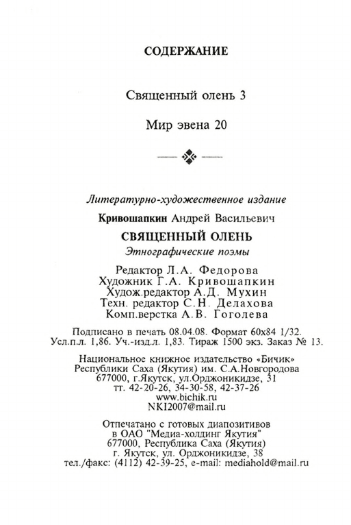 Священный олень : этнографические поэмы / Андрей Кривошапкин ; [перевод с эвенского, автор послесловия Анатолий Преловский]. - Якутск : Бичик, 2008. - 62, [2] с.