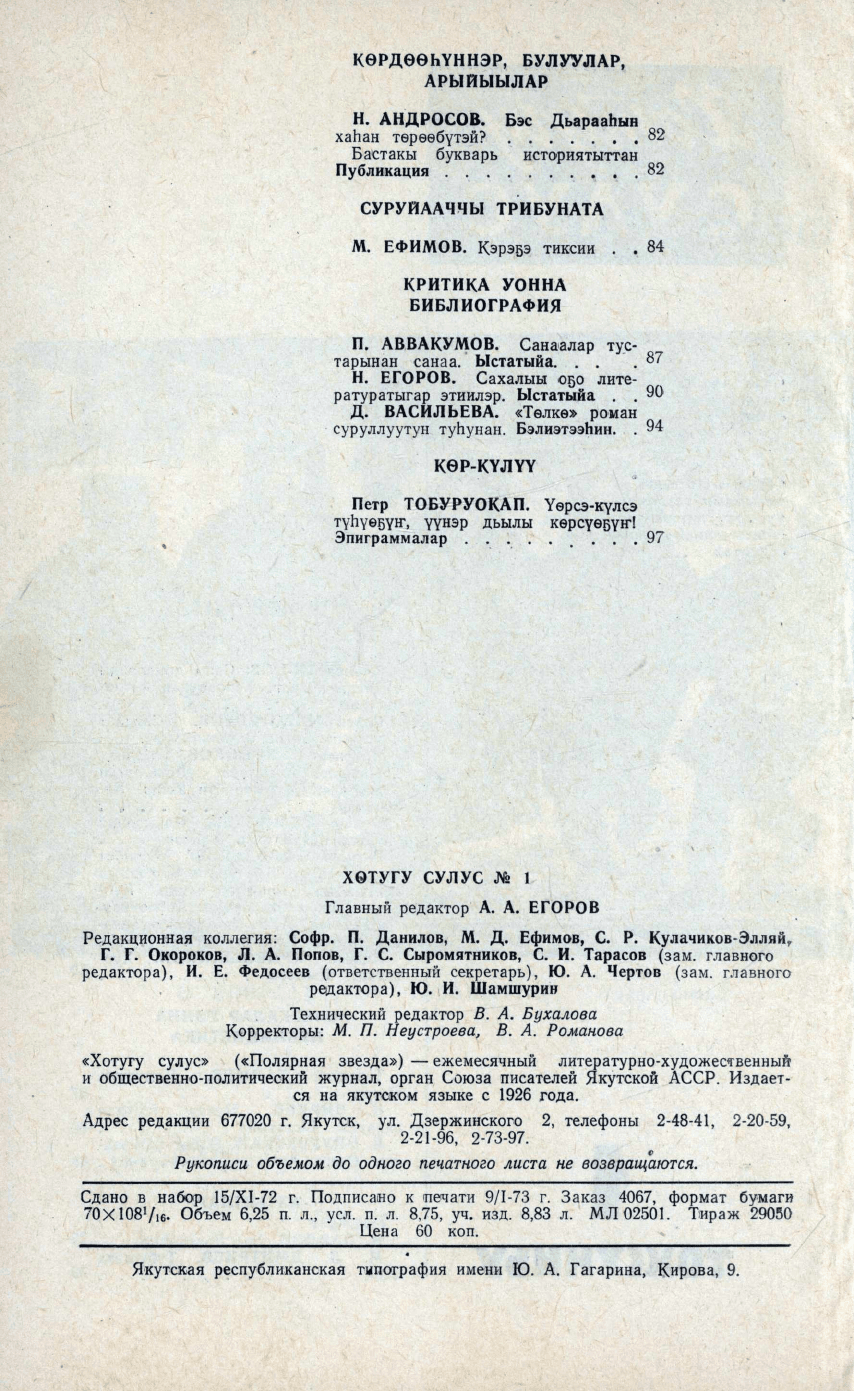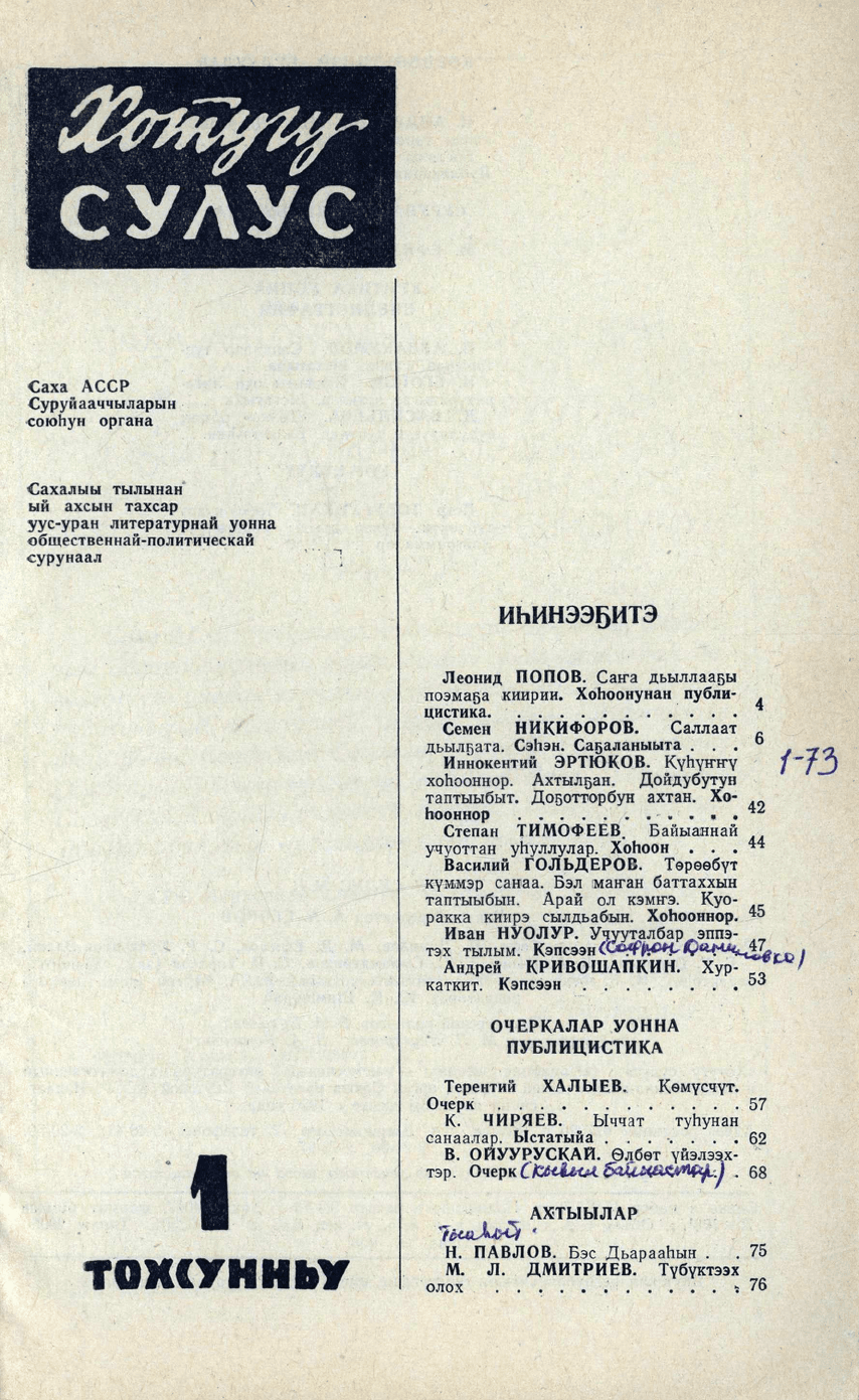 Хотугу сулус : [сахалыы тылынан уус-уран литературнай уонна общественно-политическай сурунаал] / САССР советскай суруйааччыларын союһа. - Якутскай : Саха сиринээҕи кинигэ издательствота, 1940-1989. 1973, N 1. - 1973. - 100 с.