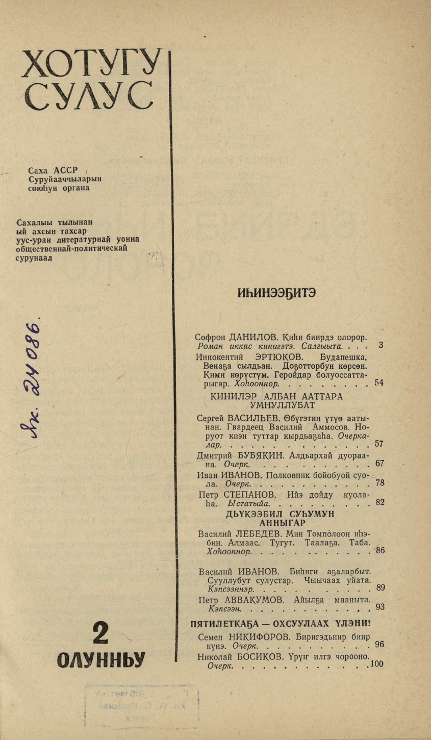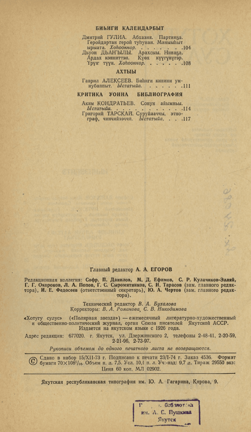 Хотугу сулус : [сахалыы тылынан уус-уран литературнай уонна общественно-политическай сурунаал] / САССР советскай суруйааччыларын союһа. - Якутскай : Саха сиринээҕи кинигэ издательствота, 1940-1989. 1974, N 2. - 1974. - 120 с.