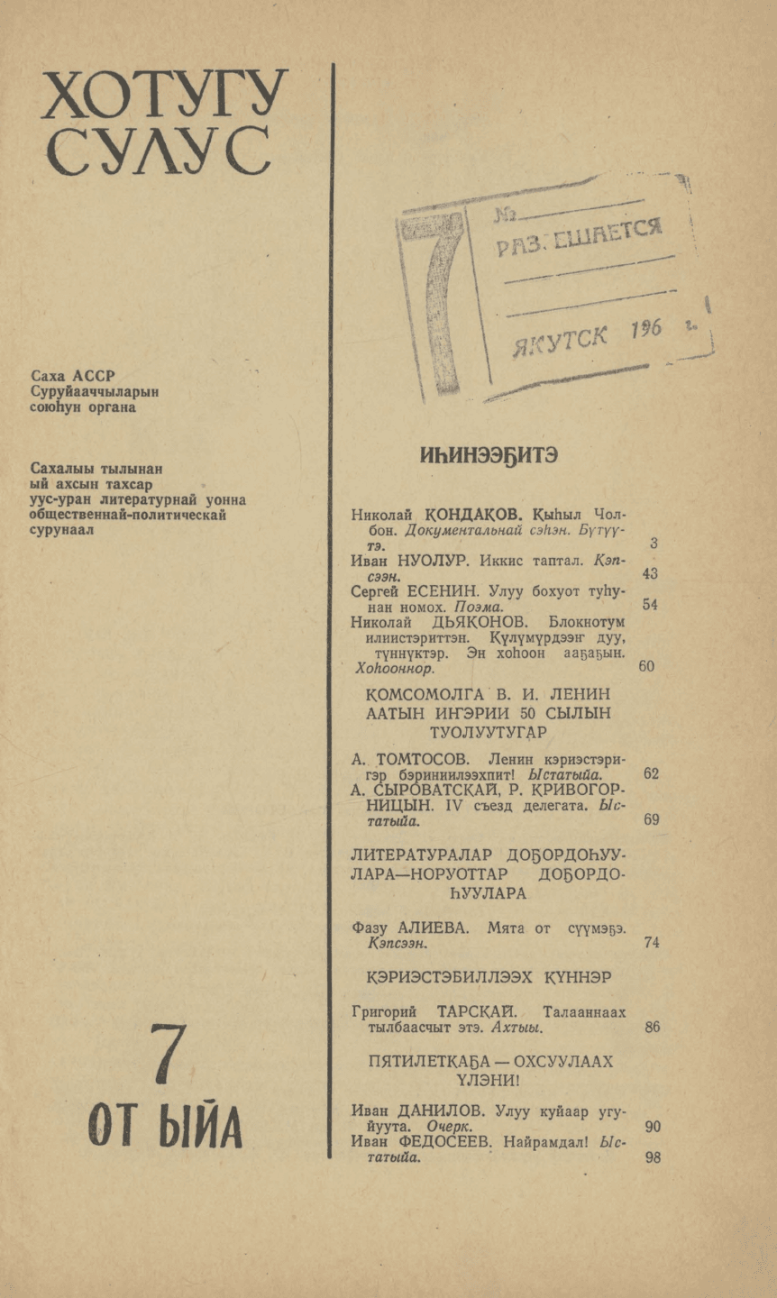 Хотугу сулус : [сахалыы тылынан уус-уран литературнай уонна общественно-политическай сурунаал] / САССР советскай суруйааччыларын союһа. - Якутскай : Саха сиринээҕи кинигэ издательствота, 1940-1989.