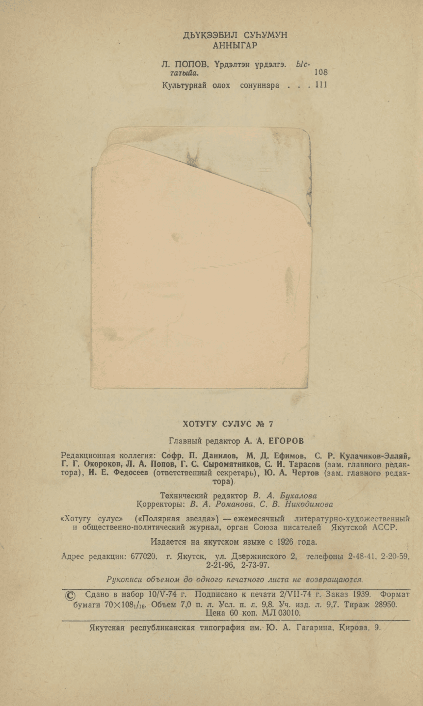 - 6. Хотугу сулус: [сахалыы тылынан уус-уран литературнай. уонна общественно-политическай сурунаал], 1974, №6