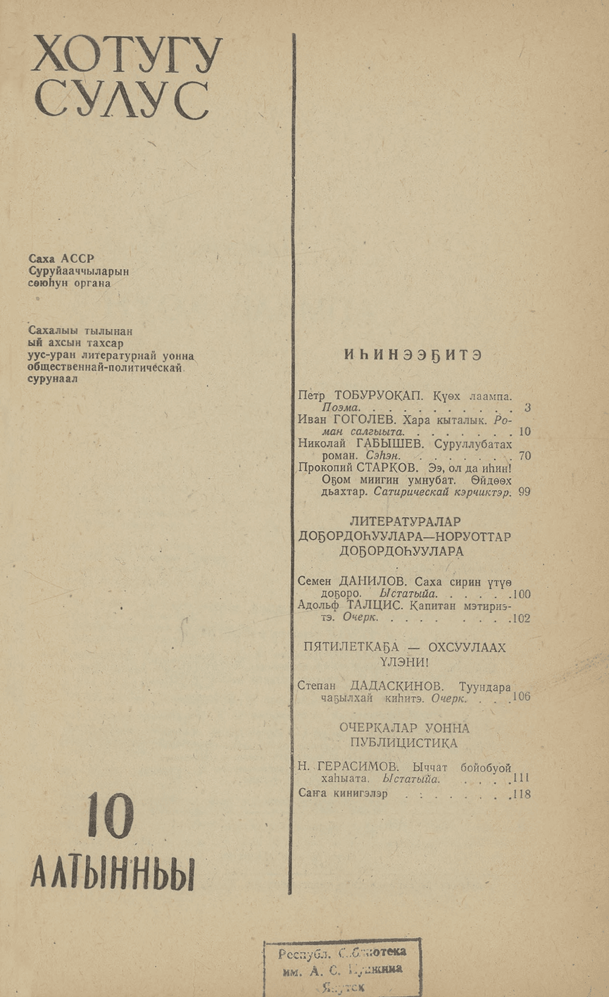 Хотугу сулус : [сахалыы тылынан уус-уран литературнай уонна общественно-политическай сурунаал] / САССР советскай суруйааччыларын союһа. - Якутскай : Саха сиринээҕи кинигэ издательствота, 1940-1989.