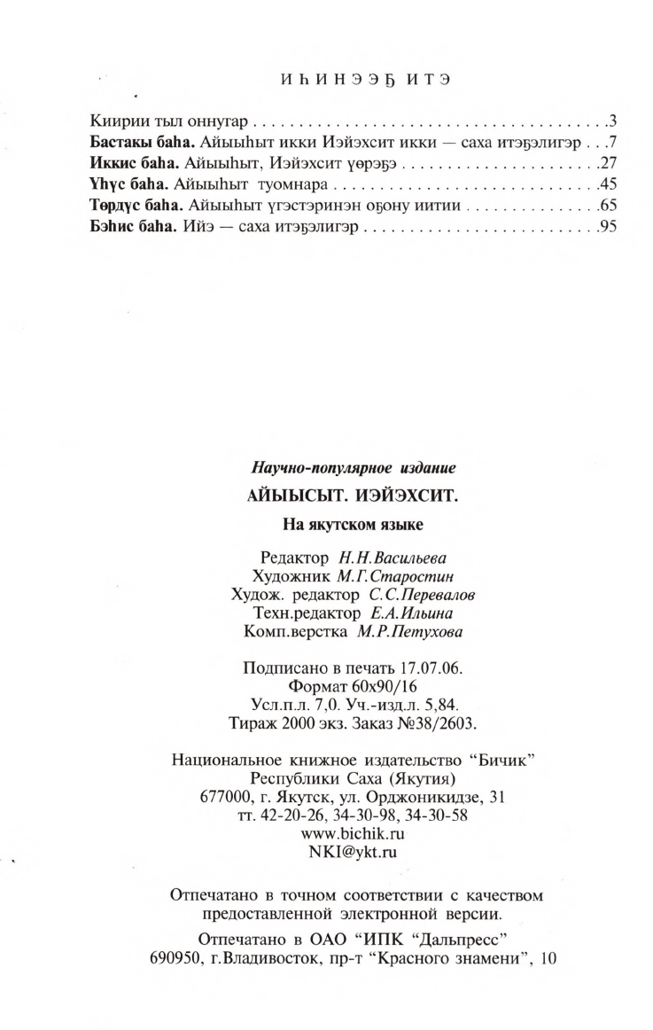 Айыыһыт. Иэйэхсит / [Р. И. Бравина уо. д. а. ; эппиэттиир ред. У. А. Винокурова]. - Дьокуускай : Бичик, 2006. - 110, [1] с.