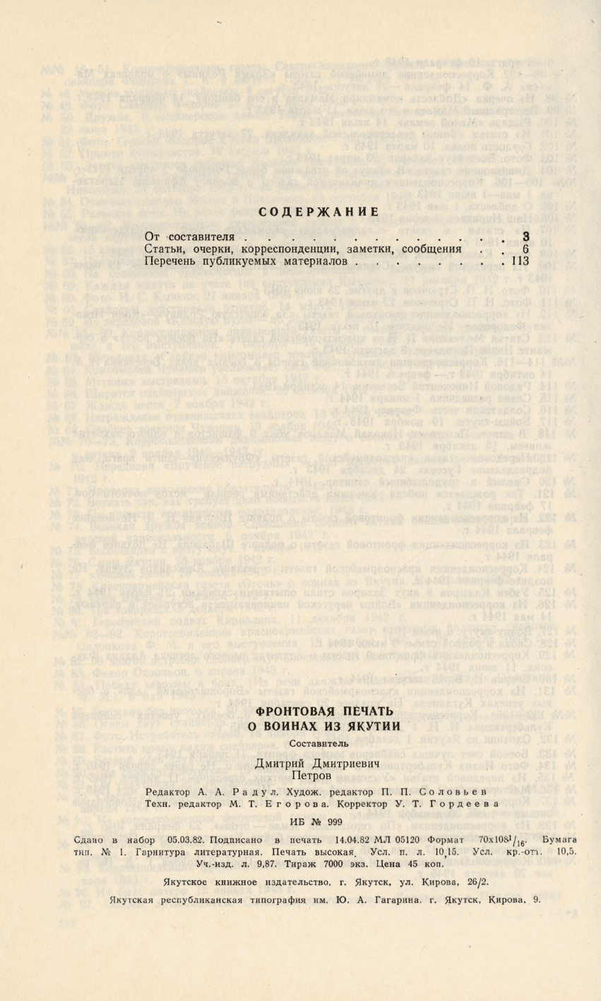 Фронтовая печать о воинах из Якутии : сборник статей, очерков, корреспонденций, заметок, сообщений / Акад. наук СССР, Сиб. отд-ние, Якут. фил. Сиб. отд-ния, Ин-т яз., лит. и истории ; [сост. Д. Д. Петров]. - Якутск : Книжное изд-во, 1982. - 116 с.