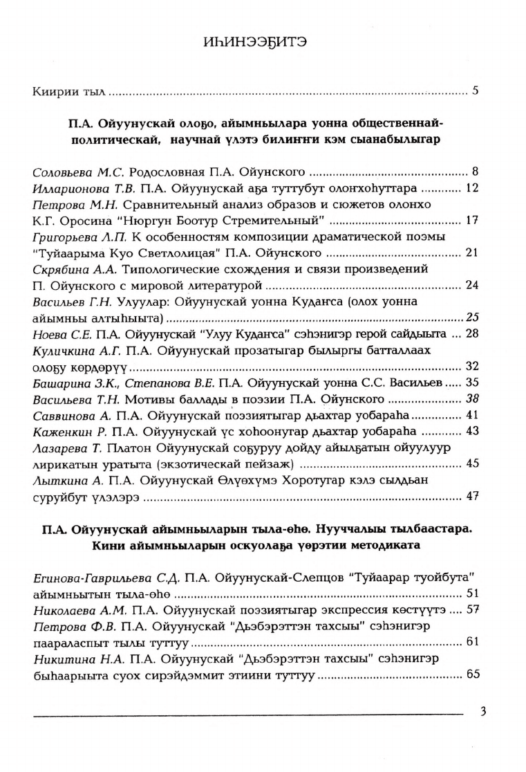П. А. Ойуунускай уонна аныгы кэм : П. А. Ойуунускай төрөөбүтэ 110 сылыгар аналлаах научнай конференциялар матырыйааллара / [хомуйан оҥордулар: П. В. Сивцева, В. Е. Степанова, Т. Н. Васильева ; редкол.: П. В. Сивцева, В. Б. Окорокова, Е. М. Поликарпова]. - Дьокуускай : Издательство ЯГУ, 2004. - 96 с.