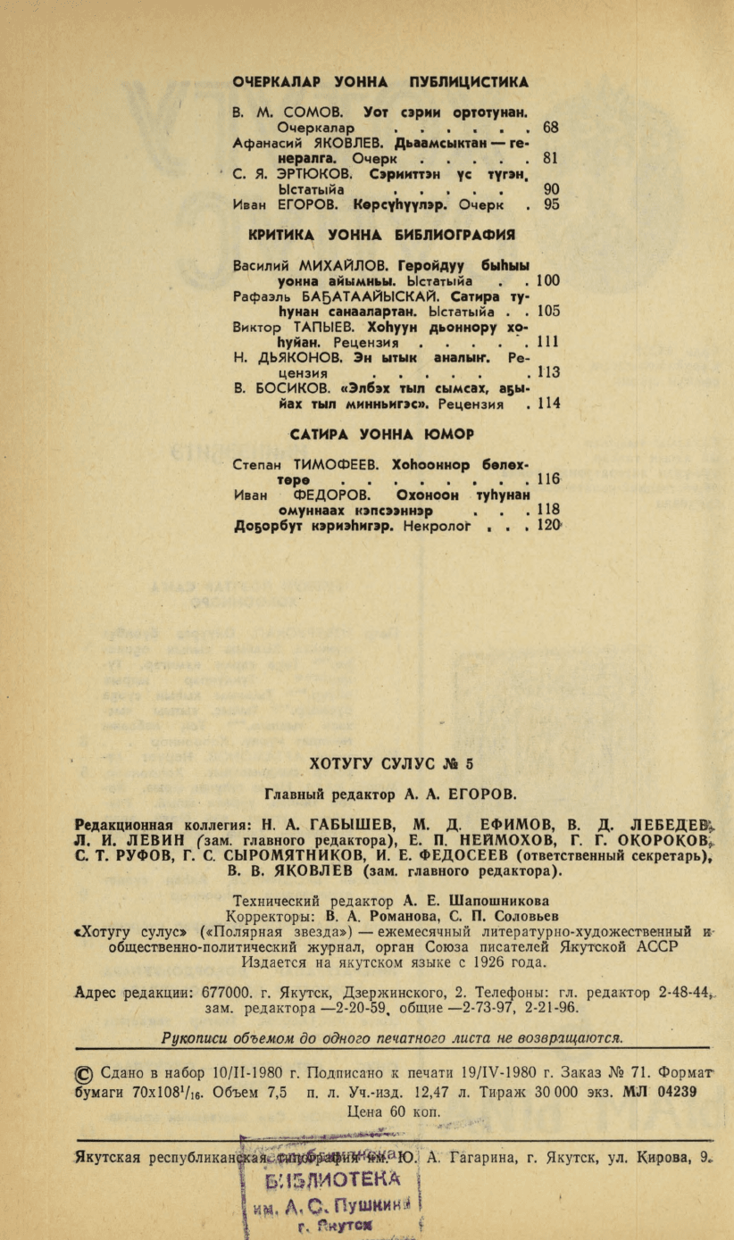 Хотугу сулус : [сахалыы тылынан уус-уран литературнай уонна общественно-политическай сурунаал] / САССР советскай суруйааччыларын союһа. - Якутскай : Саха сиринээҕи кинигэ издательствота, 1940-1989. 1980, N 5. - 1980. - 118, [2] с.