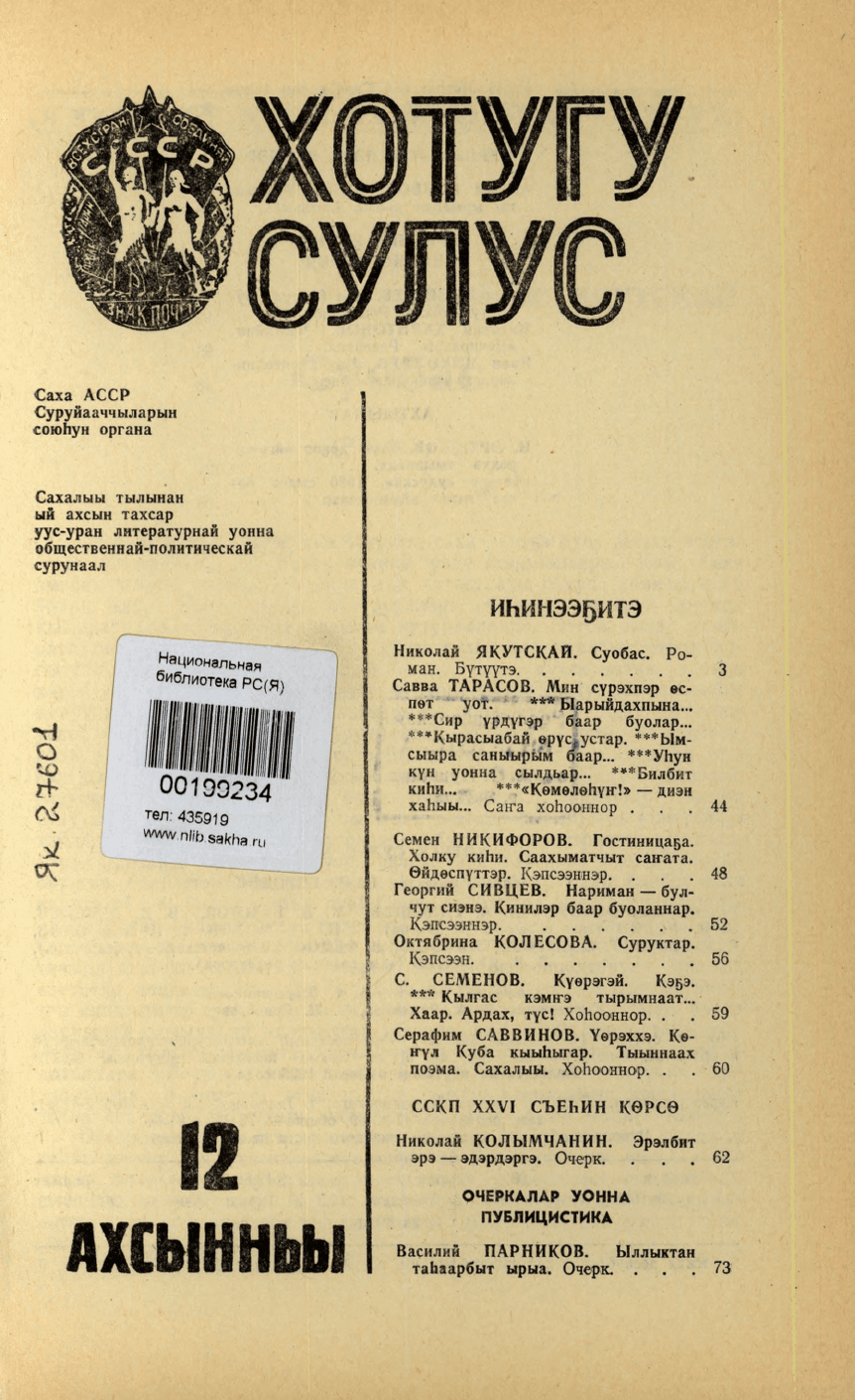 Хотугу сулус : [сахалыы тылынан уус-уран литературнай уонна общественно-политическай сурунаал] / САССР советскай суруйааччыларын союһа. - Якутскай : Саха сиринээҕи кинигэ издательствота, 1940-1989. 1980, N 12. - 1980. - 111, [1] с.