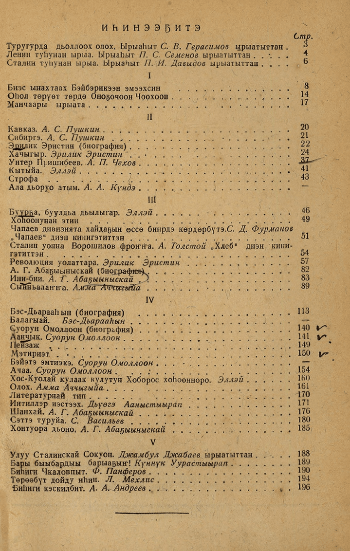 Биһиги литературабыт : толорута суох орто уонна орто оскуола 6-с кылааһын хрестоматията / С. Р. Кулачиков [уо. д.. а. оҥорбуттара]. - Якутскай : САССР государственнай изд-вата, 1941. - 195, [2] с.