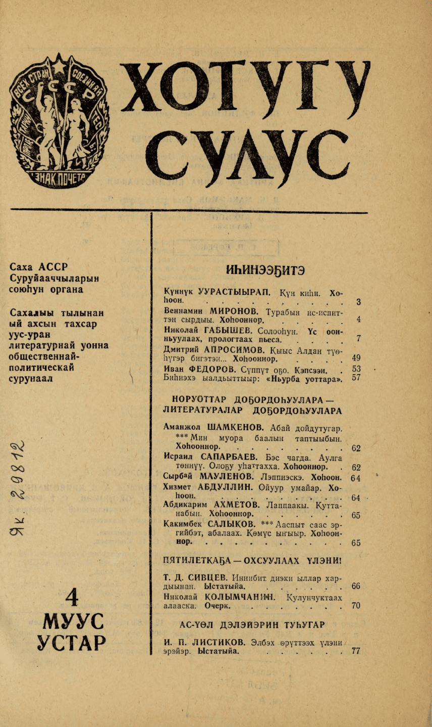 Хотугу сулус : [сахалыы тылынан уус-уран литературнай уонна общественно-политическай сурунаал] / САССР советскай суруйааччыларын союһа. - Якутскай : Саха сиринээҕи кинигэ издательствота, 1940-1989. 1983, N 4. - 1983. - 94, [2] с.