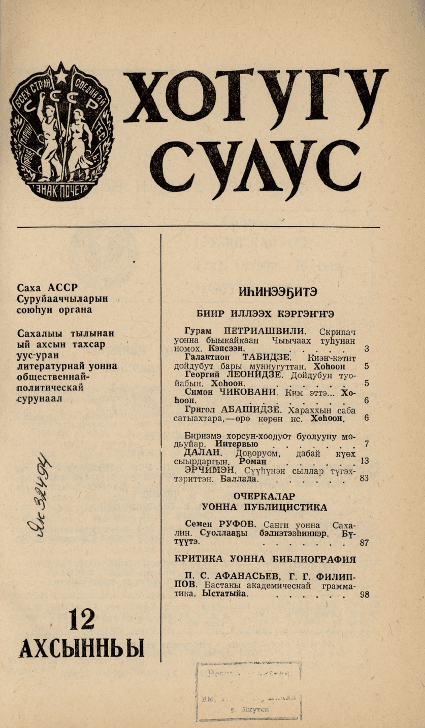 Хотугу сулус : [сахалыы тылынан уус-уран литературнай уонна общественно-политическай сурунаал] / САССР советскай суруйааччыларын союһа. - Якутскай : Саха сиринээҕи кинигэ издательствота, 1940-1989. 1986, N 12. - 1986. - 103, [1] с.