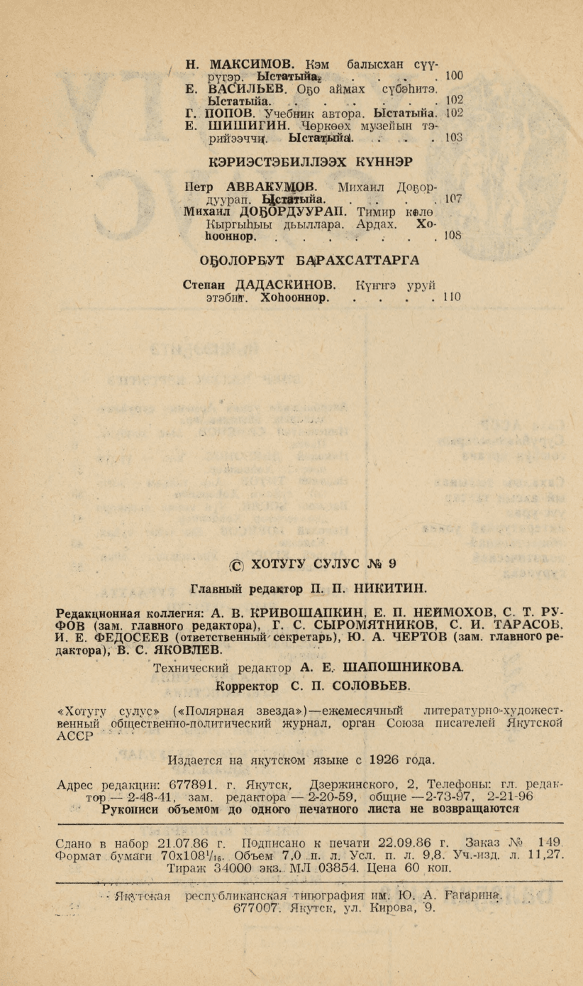 Хотугу сулус : [сахалыы тылынан уус-уран литературнай уонна общественно-политическай сурунаал] / САССР советскай суруйааччыларын союһа. - Якутскай : Саха сиринээҕи кинигэ издательствота, 1940-1989. 1986, N 9. - 1986. - 103, [1] с.