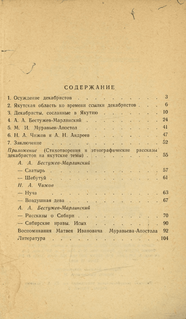 В книге профессора Ф. Г. Сафронова повествуется о жизни и деятельности одиннадцати декабристов, отбывавших якутскую ссылку. Особое внимание обращено наследию A.A. Бестужева-Марлинского, М. И. Муравьева-Апостола, Н. А. Чижова и А. Н. Андреева.