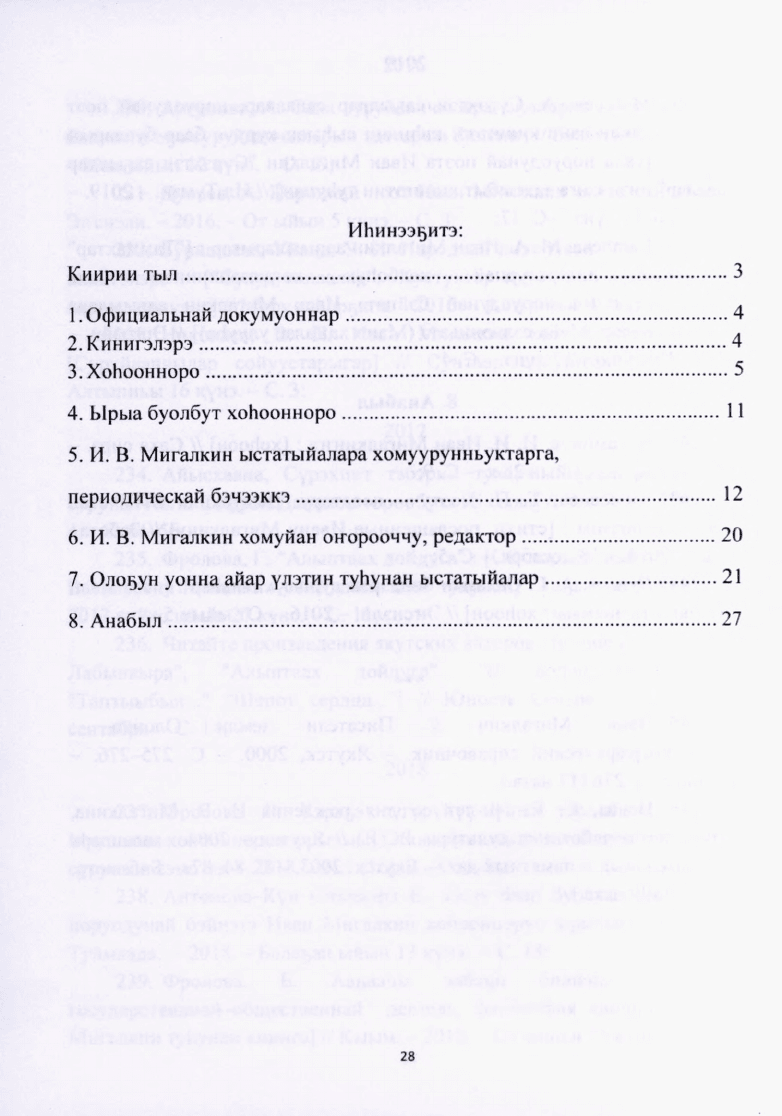 Саха Өрөспүүбүлүкэтин норуодунай бэйиэтэ Иван Васильевич Мигалкин : (биобиблиографическай ыйынньык) / "Уус-Алданнааҕы нэһилиэктэр икки ардыларынааҕы кииннэммит библиотека тиһигэ" муниципальнай хааһына тэрилтэтэ, С. С. Васильев-Борогонскай аатынан киин библиотека ; хомуйан оҥордулар: Л. Д. Копырина, М. А. Сергеева ; [киирии тылы суруйда Л. Д. Копырина]. - Бороҕон : Уус-Алданнааҕы кииннэммит библиотека тиһигэ, 2019. - 28 с.