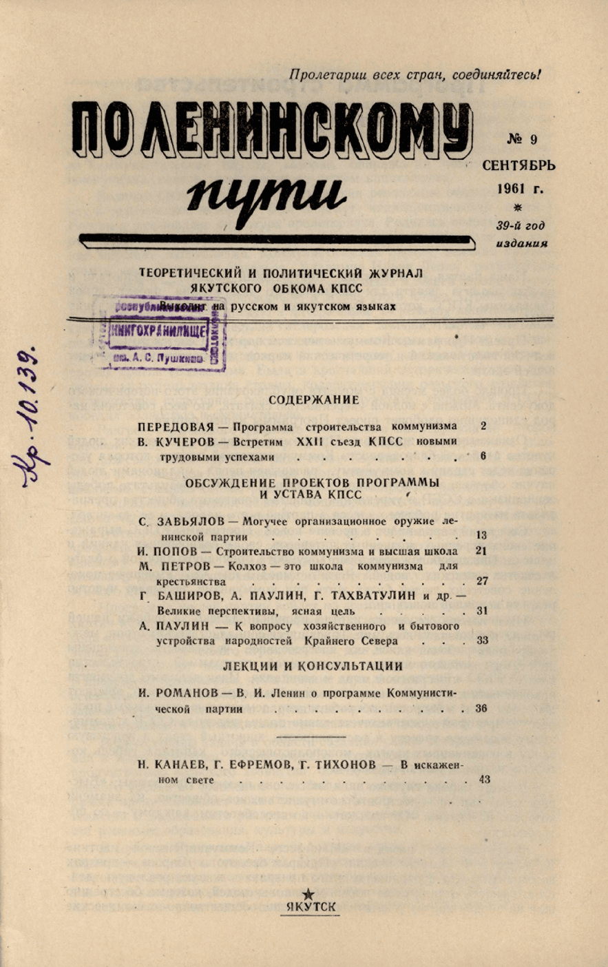 По Ленинскому пути : журнал Обкома ВКП(б) / . - Якутск : , 1922-1964.