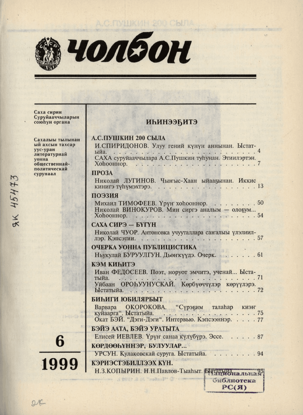 - 2. Чолбон: уус-уран литературнай уонна общественнай-политическай сурунаал, 1999, №2