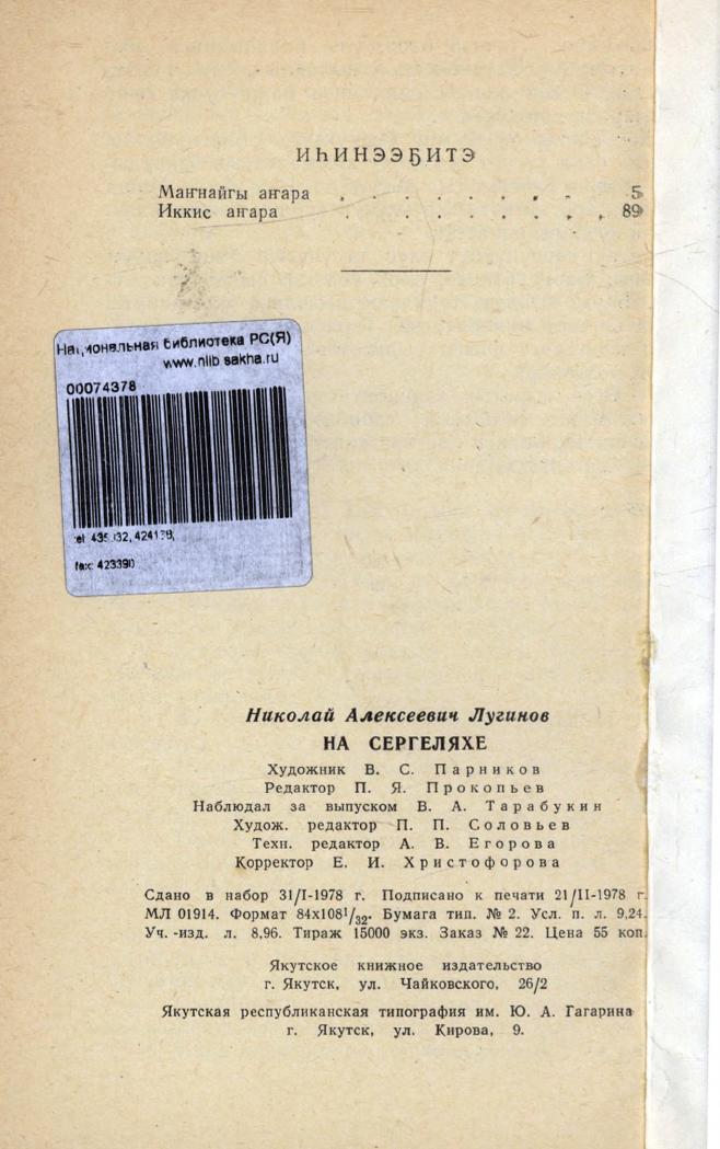 Сэргэлээххэ : сэһэн / Николай Лугинов. - Якутскай : Саха сиринээҕи кинигэ издательствота, 1978. - 174, [1] с. - 15000 экз.