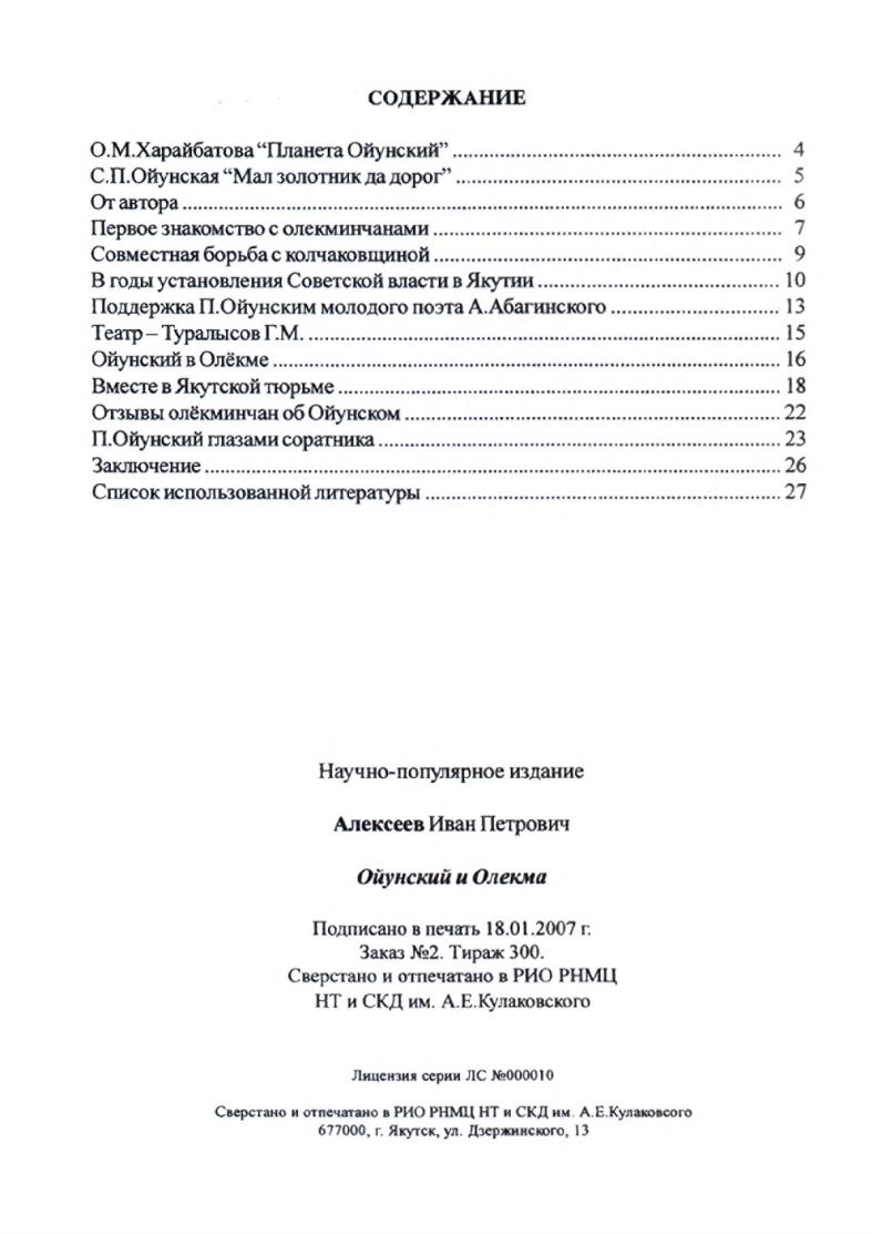 Ойунский и Олекма / И. П. Алексеев ; [редактор Тимофеева Е. П. ; автор предисловия: О. М. Харайбатова, С. П. Ойунская] ; Министерство культуры и духовного развития Республики Саха (Якутия), Департамент по вопросам духовного развития. - 2-е испр., доп. - Якутск : РНМЦ НТ и СКД, 2007. - 25, [3] с.