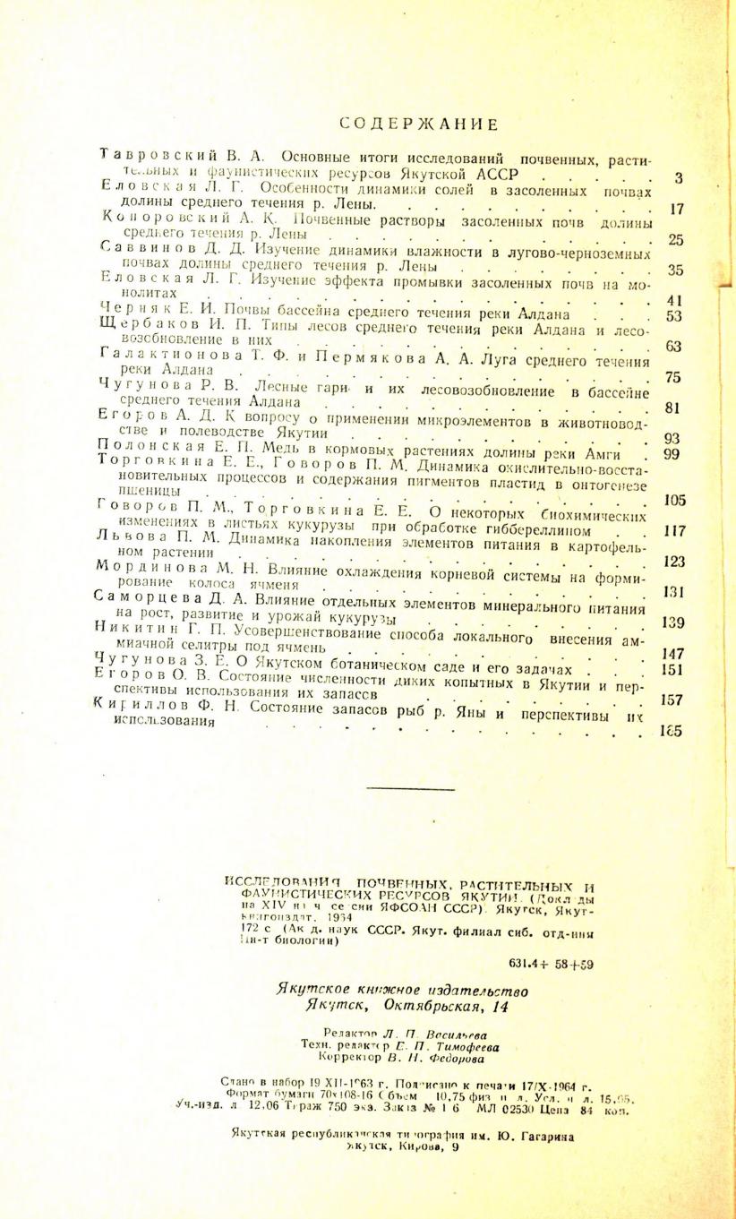 Исследования почвенных, растительных и фаунистических ресурсов Якутии : доклады на XIV научной сессии ЯФ СО АН СССР / ответственный редактор доктор биологических наук В. А. Тавровский. - Якутск : Якутское книжное издательство, 1964. - 172 с.