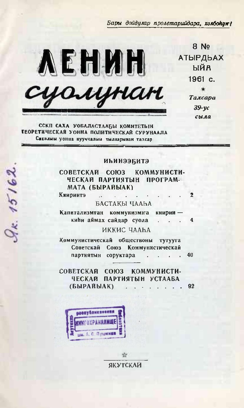 - 2. Ленин суолунан: БСК(б)П Саха сиринээҕи обкомун сурунаала, 1961, №1 (тохсунньу)