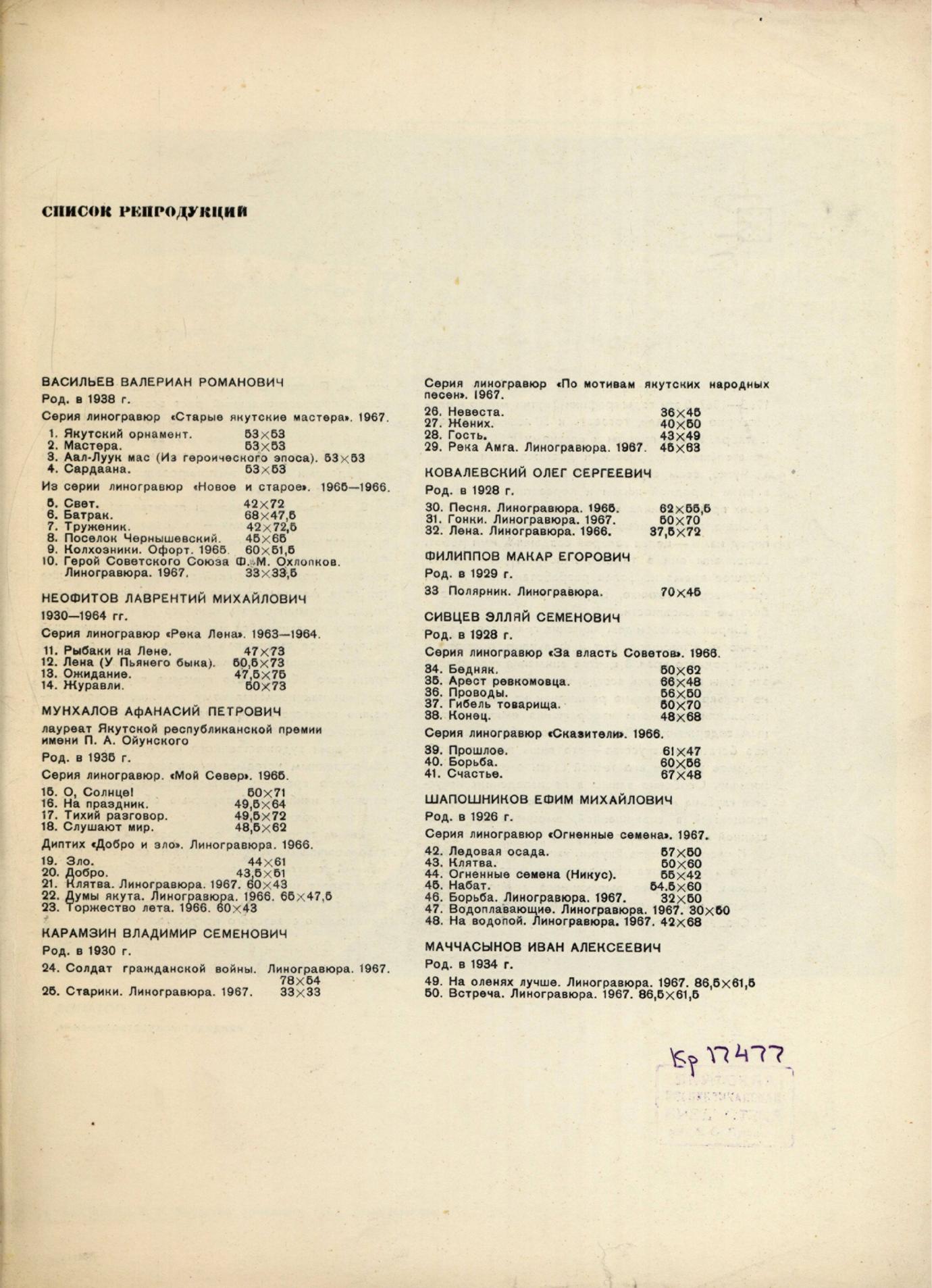 Графика Якутии. 1965 - 1967 [изоматериал] : [комплекс линогравюр]. - Якутск, 1968. - 1 обл. (50 отд.л.) ; 33Х26 см. Содерж.: 1.Ковалевский О.М. Песня. 1965, Лена. 1964, Оленьи гонки. 1964. 2.Неофитов Л.М. Рыбки на Лене. 1963, Ожидание. 1963, Лена. 1963, Журавли. 1963. 3.Васильев В.Р. Якутский орнамент. 1967, Мастера. 1967, Аал-Луук мас. 1967, Сардаана. 1967, Свет. 1965, Батрак. 1965, Труженик. 1965, Поселок Чернышевский. 1966, Колхозники. 1965, Герой Советского Союза Ф.М. Охлопков. 1965. 4. Мунхалов А.П. Добро. 1966, Солнце! 1965, На праздник. 1965, Тихий разговор. 1965, Слушают мир. 1965, Зло. 1966, Клятва. 1967, Думы якута. 1966, Торжество лета, 1967. 5. Карамзин В.С. Солдат гражданской войны. 1967, Старики. 1967, Солдат гражданской войны. 1967, Невеста. 1967, Жених. 1967, Гость. 1967, Река Амга. 1967. 6. Сивцев Э.С. Бедняк. 1966, Арест ревкомовца. 1966, Проводы. 1966, Гибель товарища. 1966, Прошлое. 1966, Борьба. 1966, Счастье. 1966. 7. Шапошников Е.М. "Ледовая осада". 1967, Клятва. 1967, Огненные семена. 1967, Набат. 1967, Борьба. 1967, Водоплавающие. 1967, На водопой. 1967. 7. Маччасынов И.А. А олени лучше. 1967, Встреча. 1967. 8. Филиппов М.Е. Полярник. 1965. - 19000 экз.