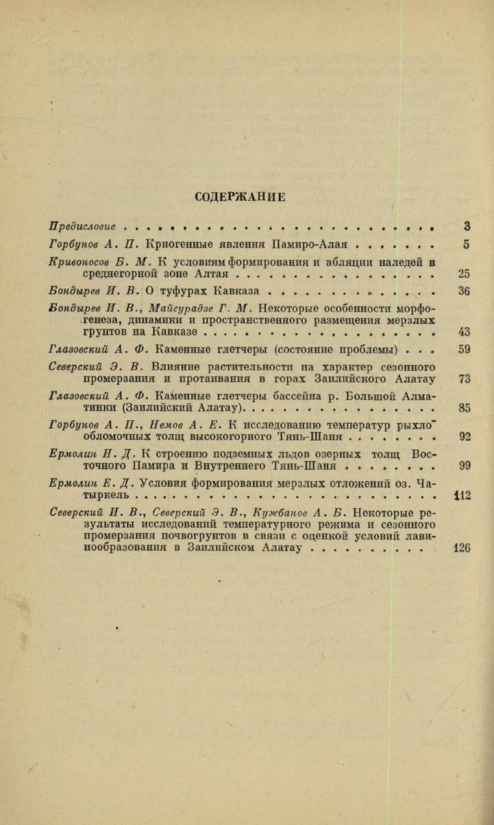 Предлагаемый сборник - первое собрание материалов по мерзлотным явлениям высоких гор юга СССР. В нем приведены результаты исследований по географии, температурам и строению многолетнемерзлых толщ Тянь-Шаня и Памиро-Алая, наледным процессам Горного Алтая, каменным глетчерам Заилийского Алатау, режиму сезонного промерзания в различных ландшафтным условиях среднегорий и высокогорий Северного Тянь-Шаня, мерзлым толщам и некоторым криогенным формам рельефа Кавказа