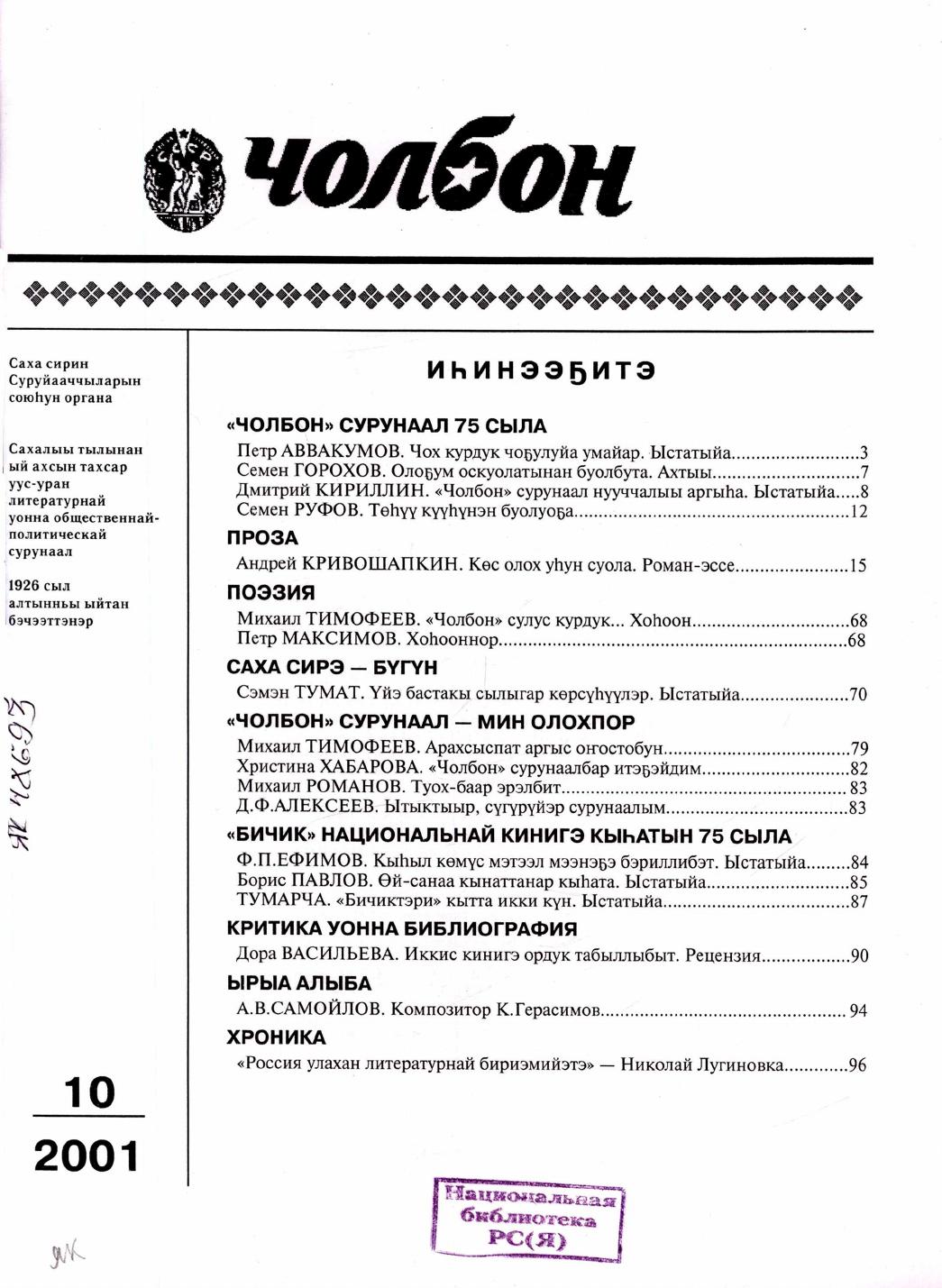 - 2. Чолбон: уус-уран литературнай уонна общественнай-политическай сурунаал, 2001, №2