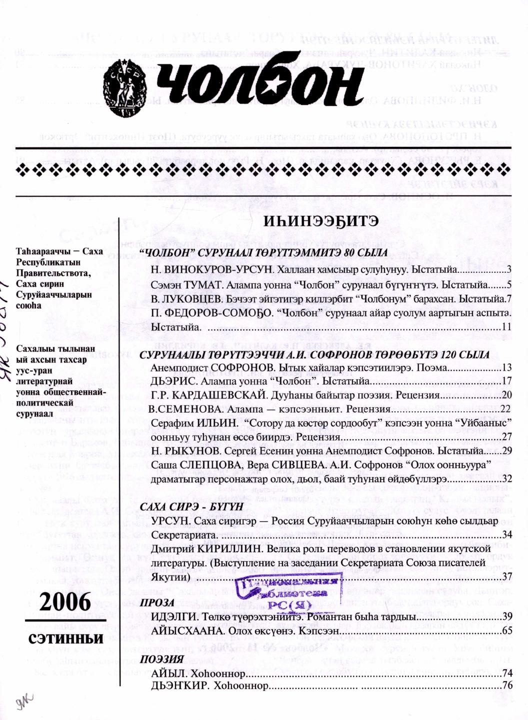 - 2. Чолбон: уус-уран литературнай уонна общественнай-политическай сурунаал, 2006, №2