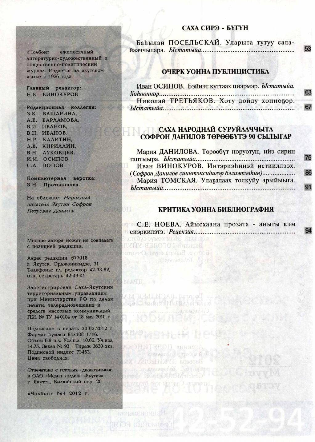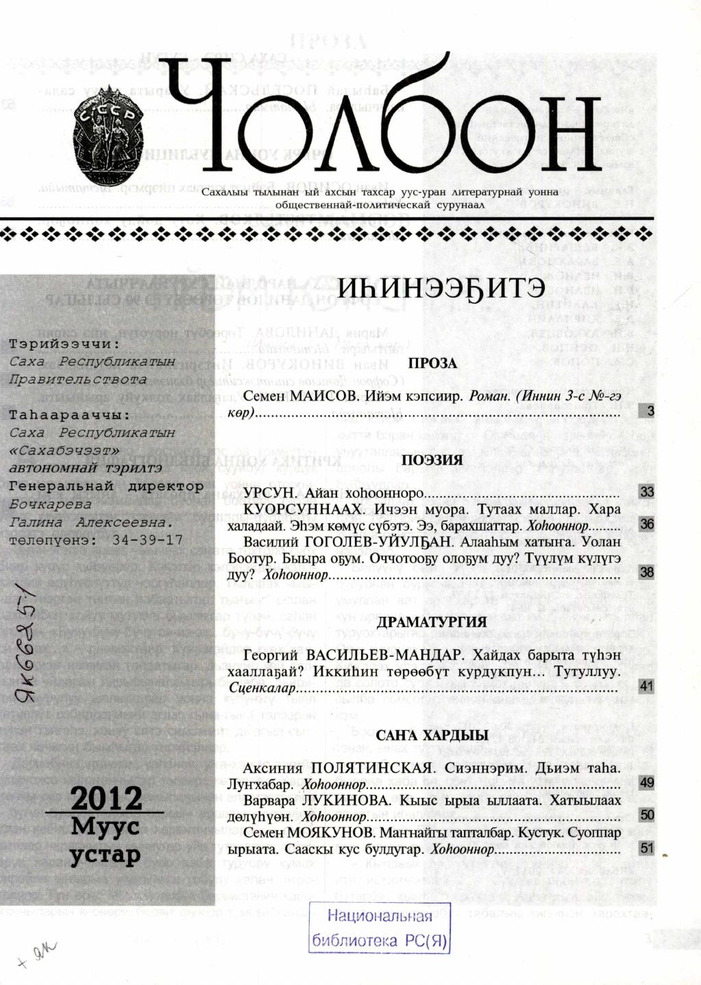 - 1. Чолбон: уус-уран литературнай уонна общественнай-политическай сурунаал, 2012, №1 (тохсунньу)