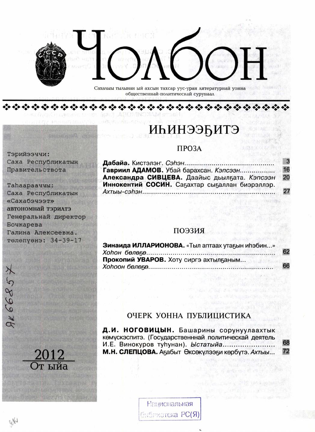 - 1. Чолбон: уус-уран литературнай уонна общественнай-политическай сурунаал, 2012, №1 (тохсунньу)