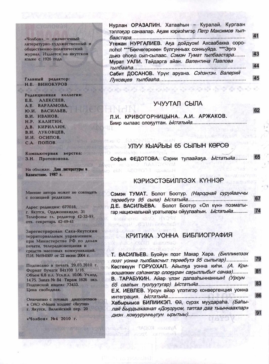 - 2. Чолбон: уус-уран литературнай уонна общественнай-политическай сурунаал, 2010, №2 (олунньу)