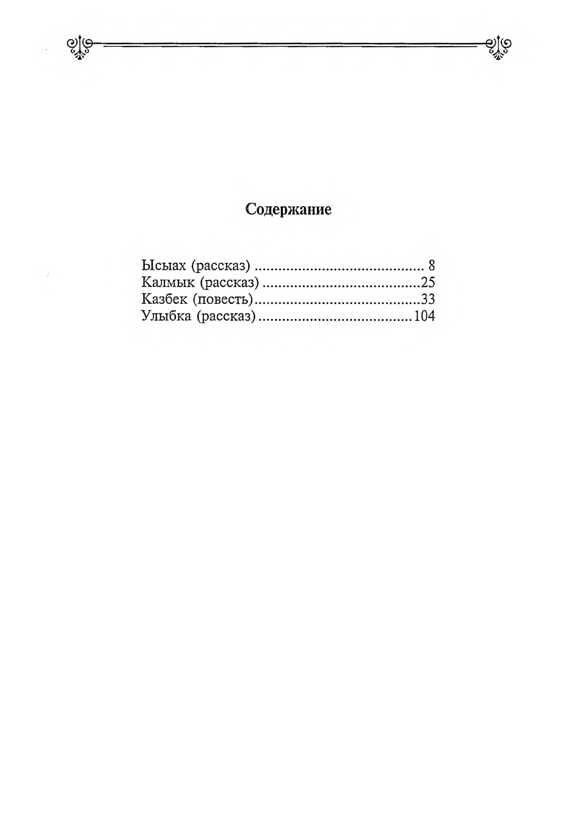 В сборник прозы рано ушедшего из жизни талантливого юкагирского писателя Геннадия Дьячкова вошли три рассказа и автобиографическая повесть «Казбек». В этих произведениях Г. Дьячкова раскрывается мир детских увлечений и открытий, рассказывается о раздумьях повзрослевшего героя в выборе правильного жизненного пути.