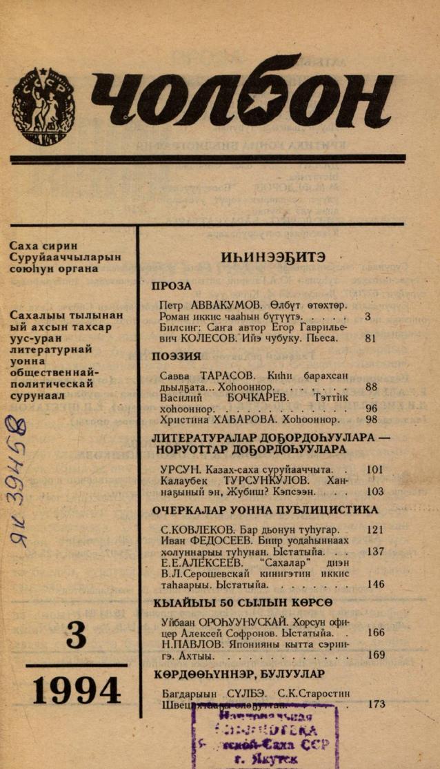 - 3. Чолбон: уус-уран литературнай уонна общественнай-политическай сурунаал, 1994, №4