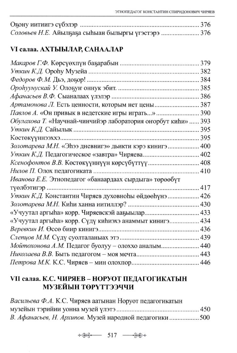 Книга о заслуженном учителе Якутской АССР и РС(Я), преподавателе педагогики и психологии, отличнике народного просвещения, академике Академии творческой педагогики России, основателе первого в стране музея народной педагогики в с. Оросу Верхневилюйского района Якутии Константине Спиридоновиче Чиряеве