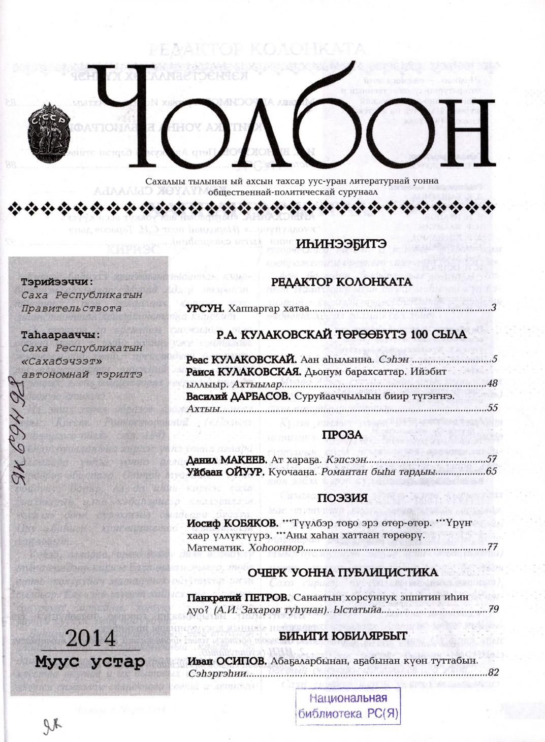 - 1. Чолбон: уус-уран литературнай уонна общественнай-политическай сурунаал, 2014, №1 (тохсунньу)