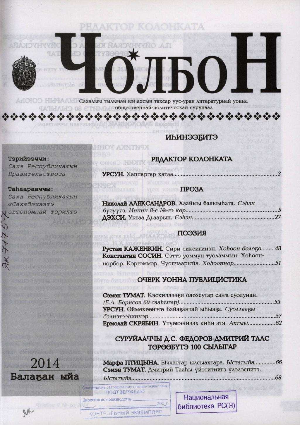 - 1. Чолбон: уус-уран литературнай уонна общественнай-политическай сурунаал, 2014, №1 (тохсунньу)
