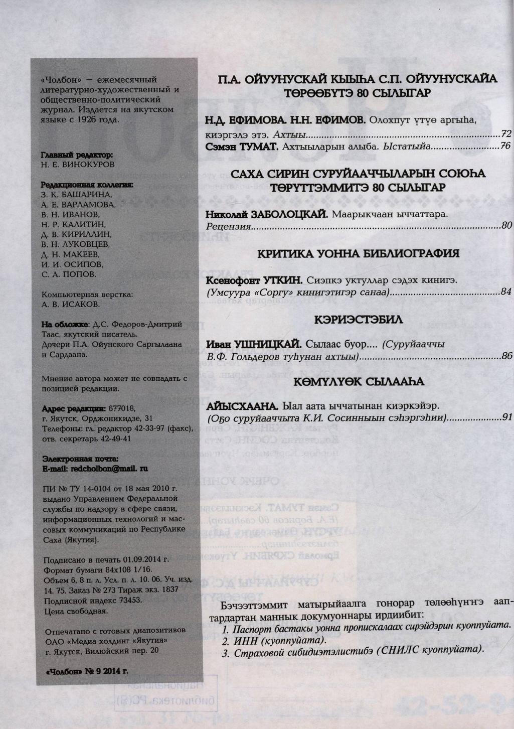 - 2. Чолбон: уус-уран литературнай уонна общественнай-политическай сурунаал, 2014, №2 (олунньу)