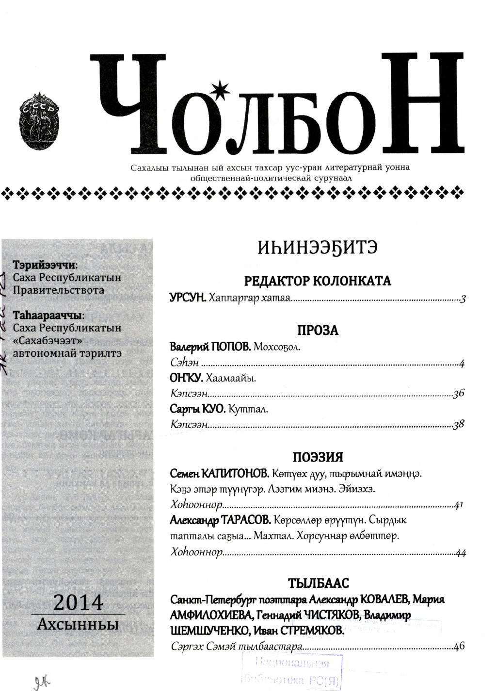 - 2. Чолбон: уус-уран литературнай уонна общественнай-политическай сурунаал, 2014, №2 (олунньу)