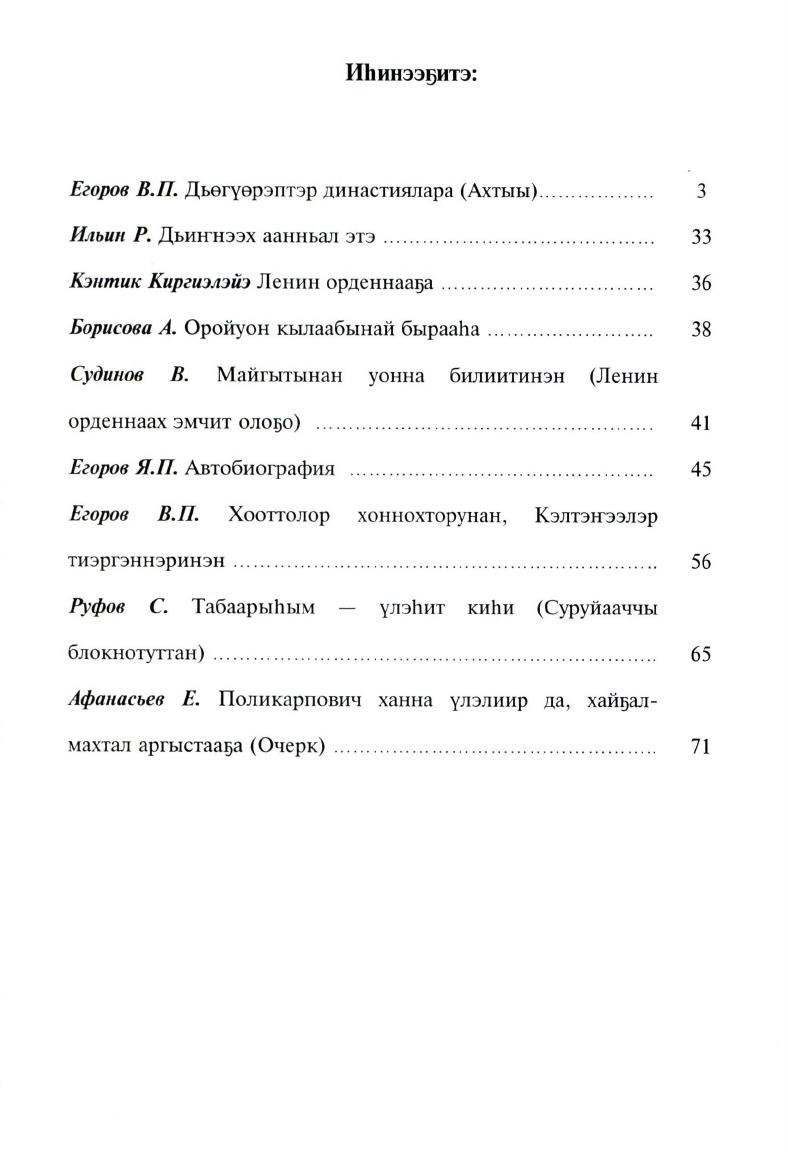 В книгу включены воспоминания о братьях Егоровых: кавалере ордена Ленина, заслуженном враче РСФСР, почетном гражданине Верхневилюйского улуса Я. П. Егорове и кавалере ордена "Трудового Красного Знамени", заслуженном работнике народного хозяйства ЯАССР, почетном гражданине Верхневилюйского улуса В. П. Егорове. Также в книге основное место занимают воспоминания В. П. Егорова о своей семье