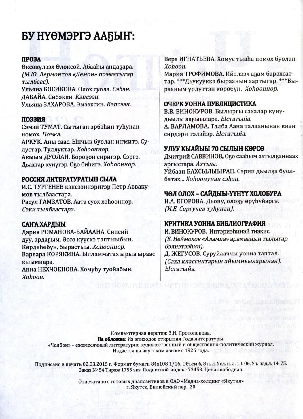 - 2. Чолбон: уус-уран литературнай уонна общественнай-политическай сурунаал, 2015, №2