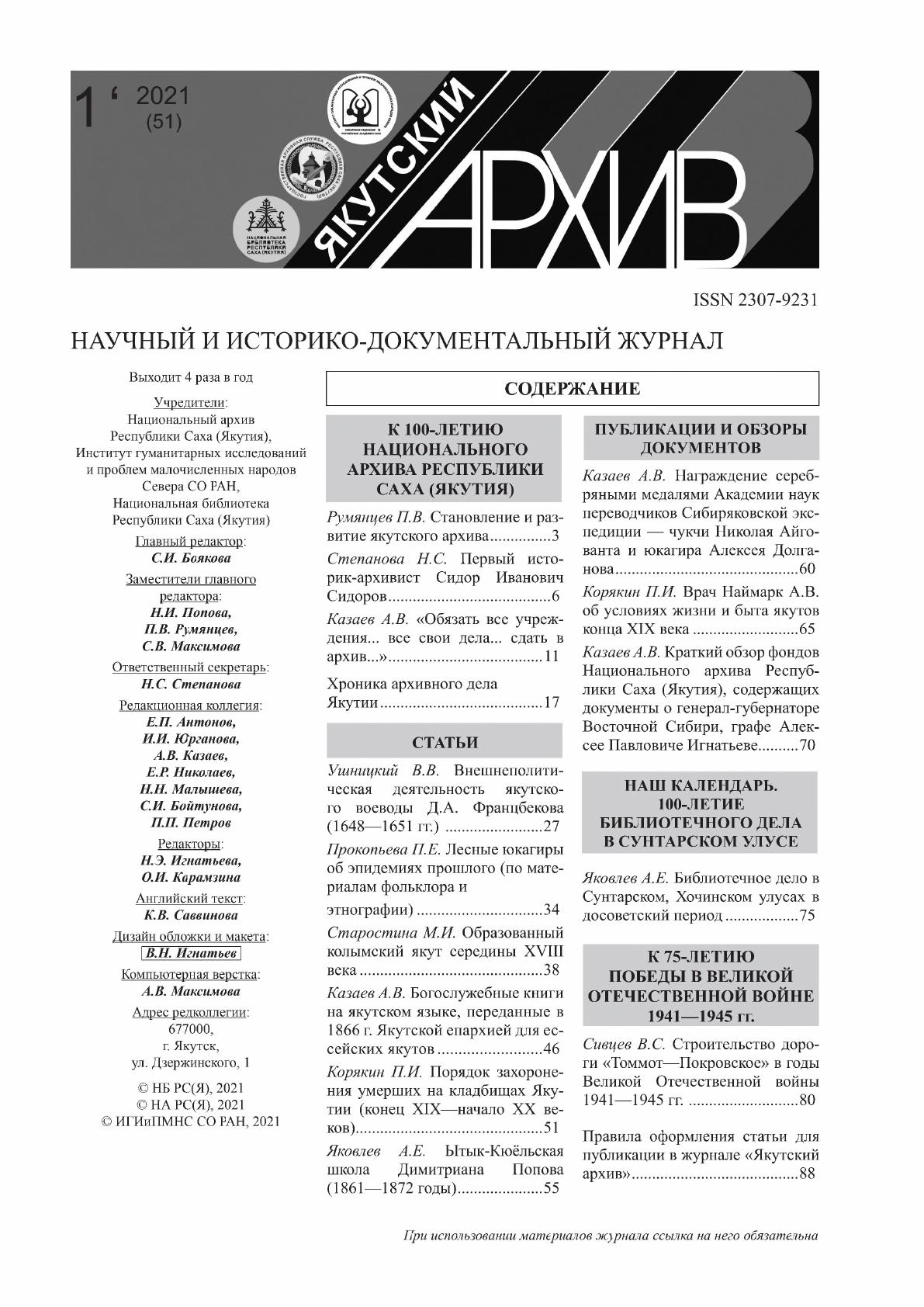 Якутский архив [Текст: Электронная копия] : научный и историко-документальный журнал / гл. ред. В.Н. Иванов. - (Якутск : Национальная библиотека Республики Саха (Якутия), 2017). 2021, N 1 (51). - 2021. - 1 файл (91 с. ; 9,20 Мб)