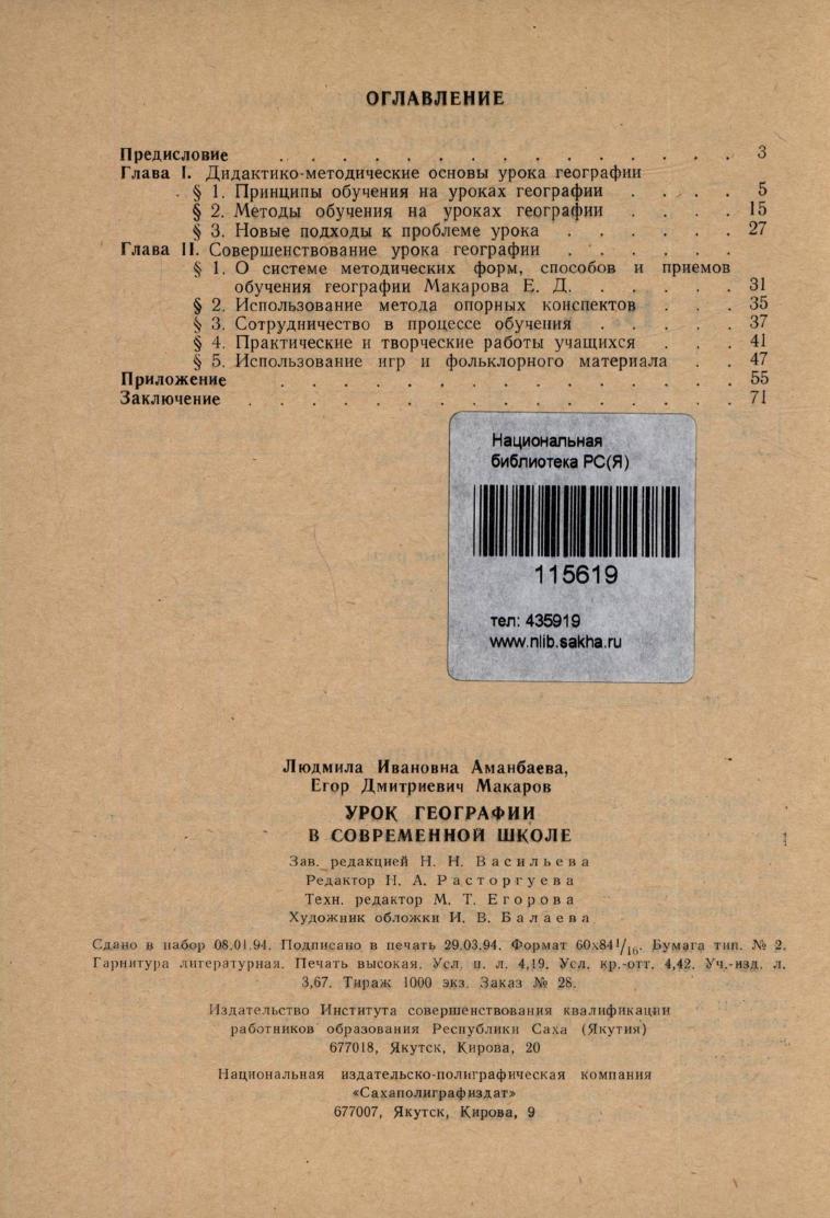 Урок географии в современной школе / Л. И. Аманбаева, Е. Д. Макаров ; Институт совершенствования квалификации работников образования Республики Саха. - Якутск : Издательство ИСКРО, 1994. - 70, [2] с.